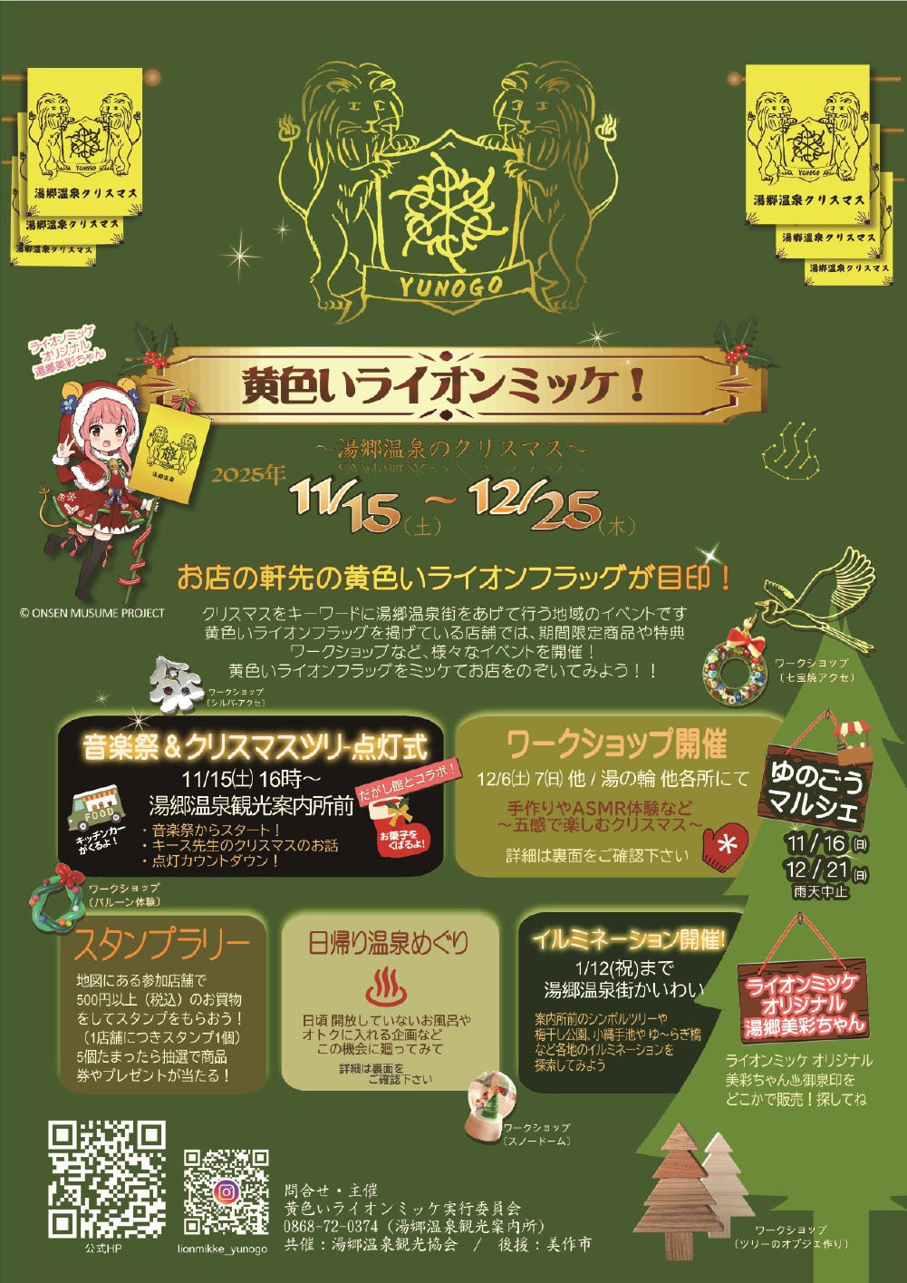 クリスマスをキーワードに湯郷温泉街をあげて行う地域のイベントです黄色いライオンフラッグを掲げている店...