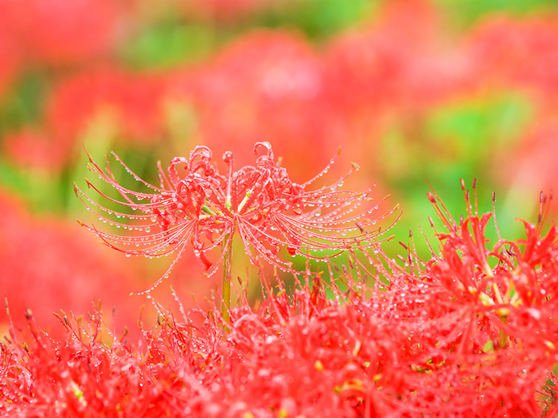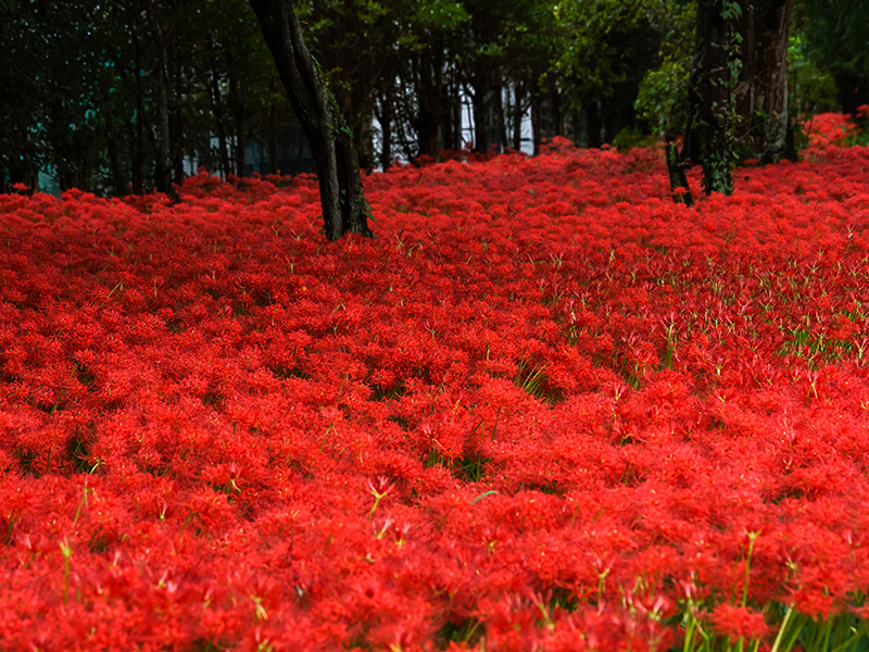 秋彼岸が近づくと、川東公園の一角がまばゆいほどの赤に染まります。咲きそろった彼岸花――リコリス・ラジアータが、まるで火の波のように地表を埋め尽くし、訪れる人の足を思わず止めさせます。