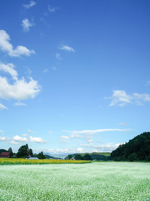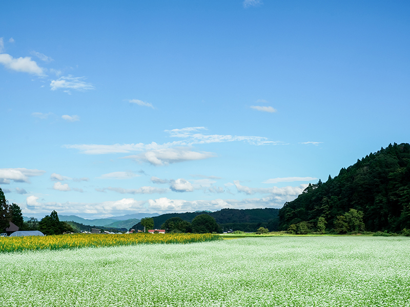 蒜山高原に広がる蕎麦畑は、まさに風の通り道。涼やかな空気が草の香りを運び、目の前にはどこまでも続く白い蕎麦の花。標高の高いこの地では、陽射しもどこか柔らかで、眩しさと清涼感が同居しています。鳥のさえずりと虫の音が調和する中、そっと風が花を揺らすたびに、自然の呼吸が聞こえてくるようでした。忙しい日常をひととき忘れさせてくれる、そんな風景がここにはあります。