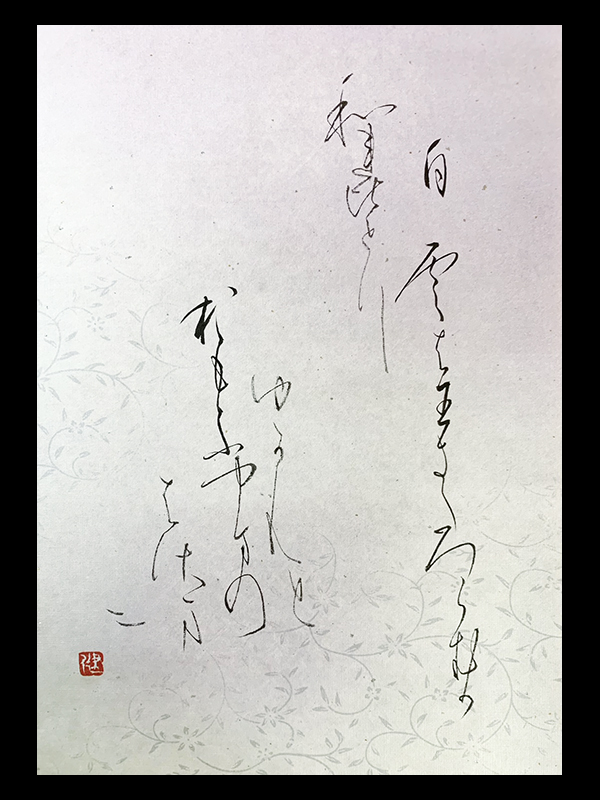 仮名書の「散らし書き」で書作。料紙のぼかし、柄、金銀箔砂子の美を生かして、紙面にどのように文字を配置し墨継ぎを何処にするかなど、散らし書きの無限性を楽しみつつ…