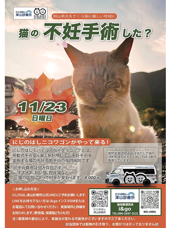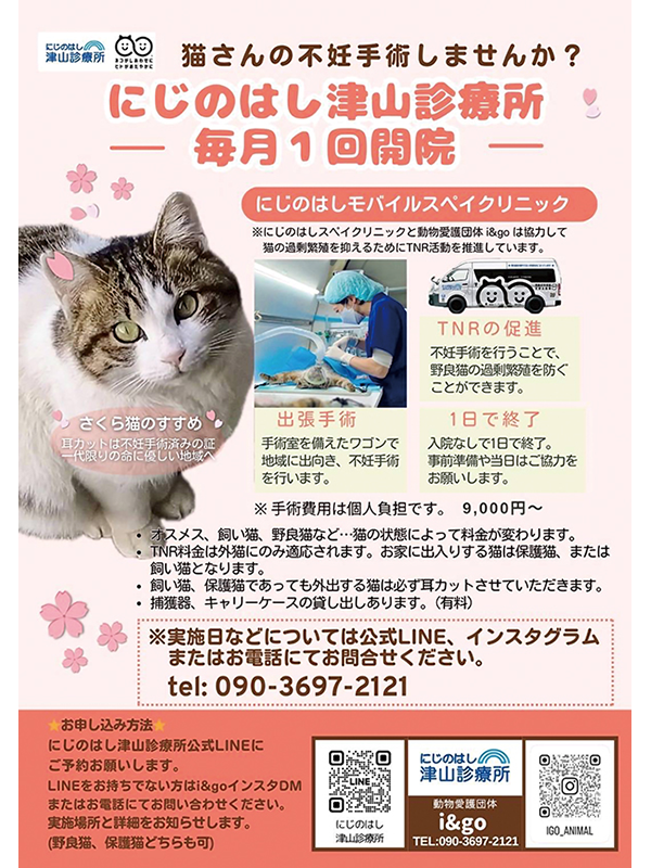 特に、『にじのはしモバイルスペイクリニック津山診療所』を毎月開催し、野良猫の不妊去勢手術を実施するなどの活動は、知っている人も多いのではないだろうか。