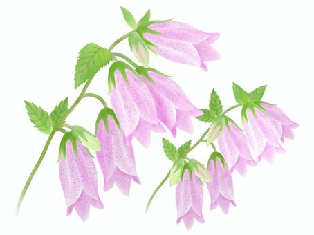 庭に赤紫と白のホタルブクロが咲いている。釣鐘状の花をいくつも付け下向きに咲いている。細い茎に大きな...
