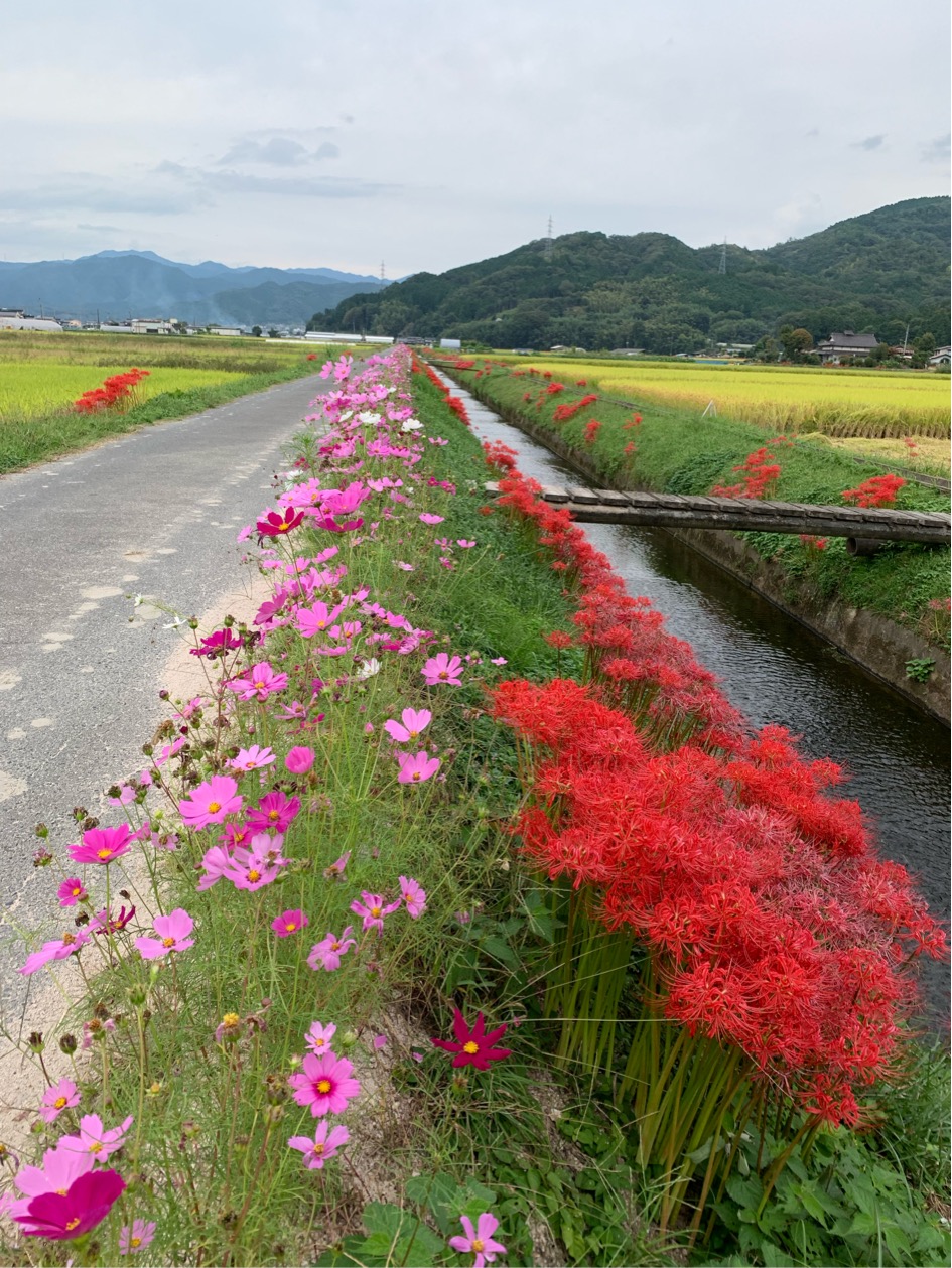 一緒に彼岸花見た、配布員の森岡さん。「まっすぐ長ーいお花の道があるんよ」と連れて行ってくれました。水...