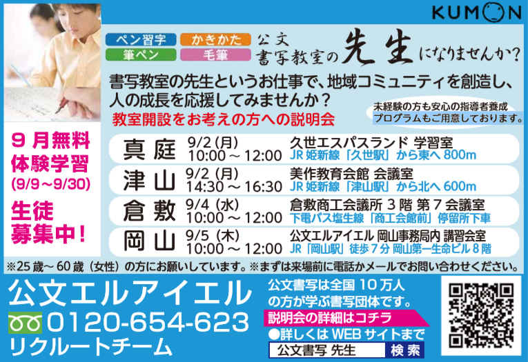 クライアントの情報です。公文エルアイエルさんが、教室開設の説明会を開催されます。脱サラ希望の方や新し...