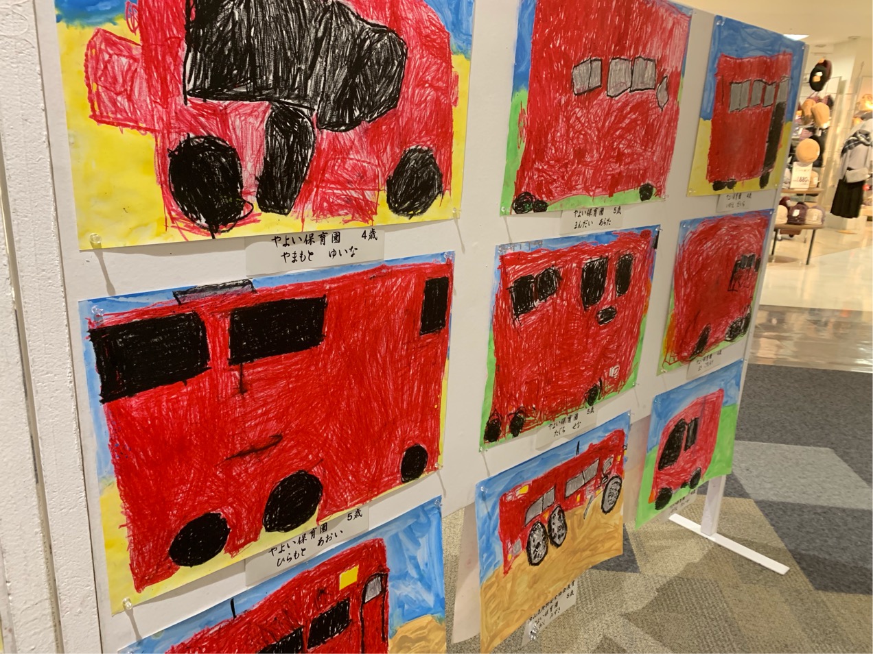 イオンモール2階で消防の絵が展示されています。あーすごいなあなんも考えずに描いてるのかごんごん描いて...