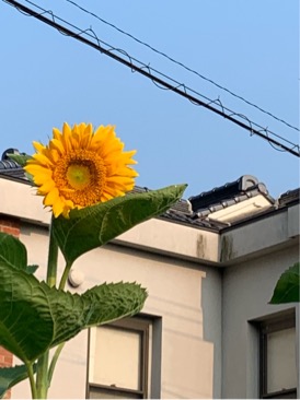ゆいちゃんとおじいちゃんの植えたひまわりが咲いています。真っ青な空の中キリッと立っています。茎もとっ...