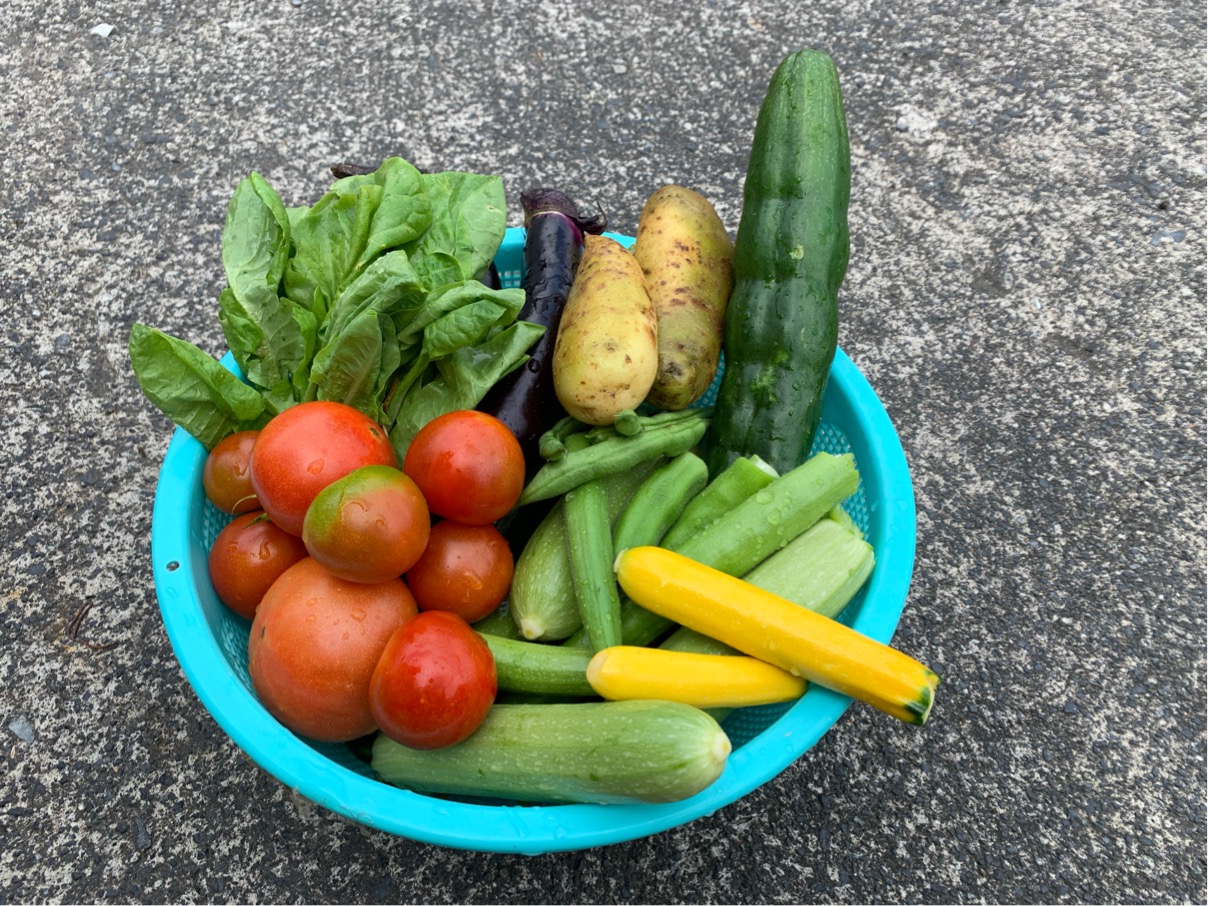 出勤前に、家の裏にある猫の額ほどの畑で収穫しました。サラダ菜トマトきゅうりじゃがいもズッキーニインゲ...