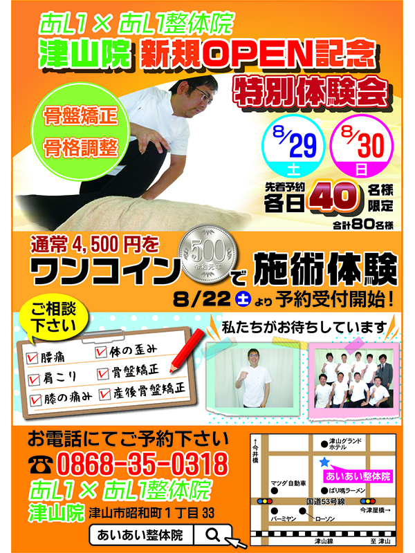 通常4500円の骨盤・骨格調整をOPENイベントに伴い500円で行います。 各日、先着予約80名様ま...