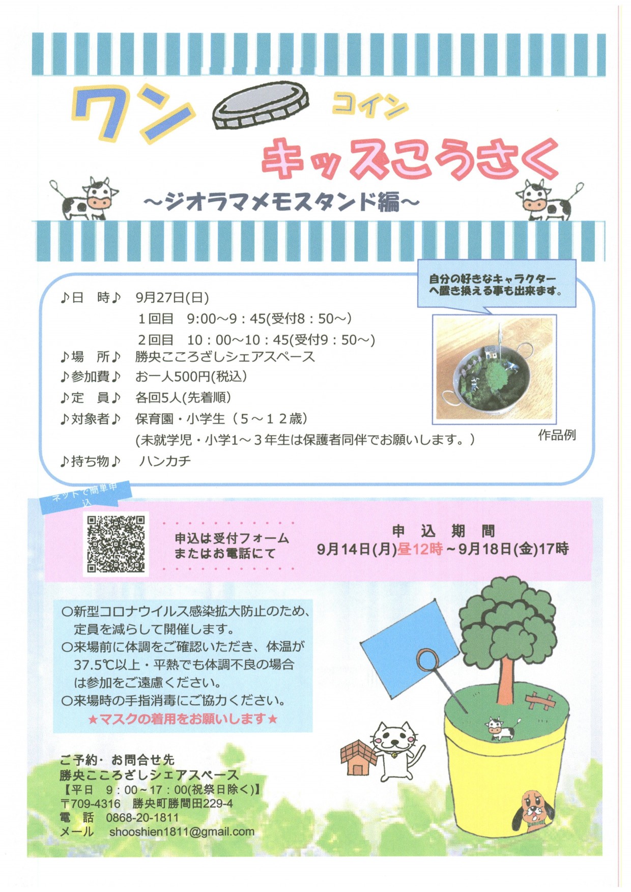 日時2020年9月27日(日)① 9:00~② 10:00~場所勝央こころざしシェアスペース勝央町勝...