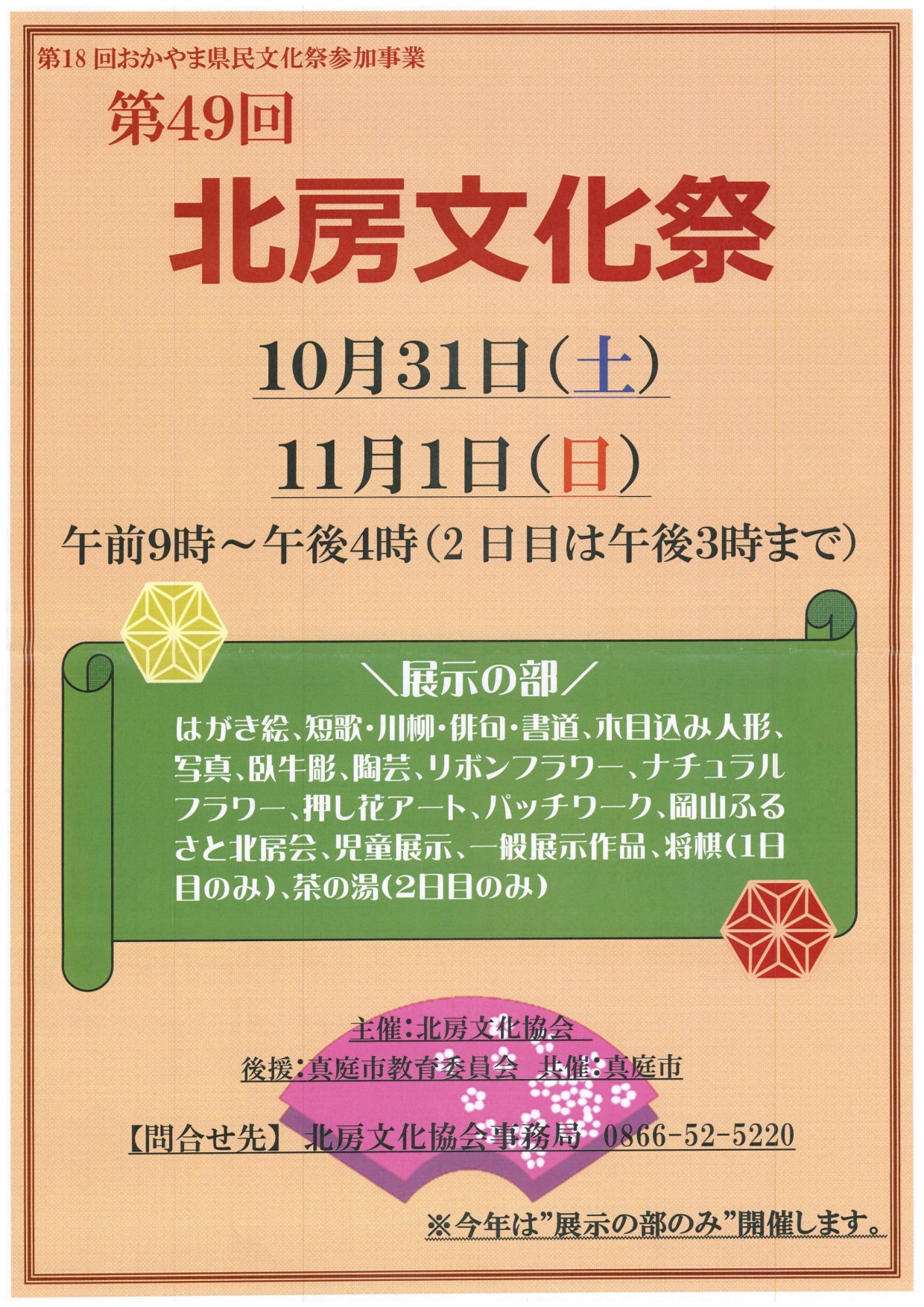 日時10月31日(土)~11月1日(日)場所真庭市北房文化センター真庭市上水田3131【問い合わせ】...