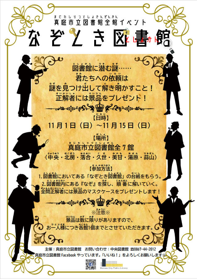 図書館に潜む謎を見つけ出し、解き明かそう!【参加方法】1.図書館においてある「なぞとき図書館」の台紙...