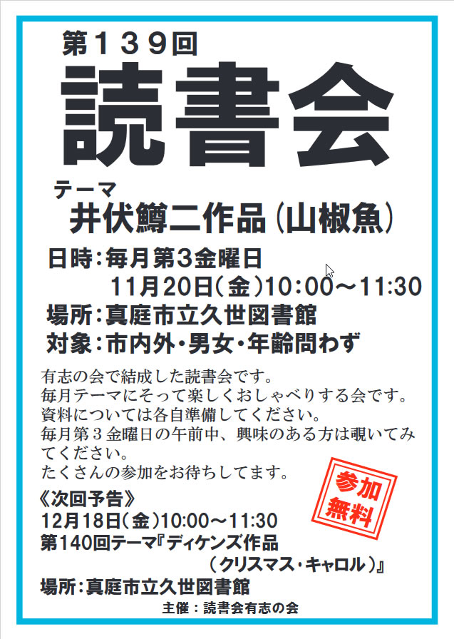 テーマの本について、楽しいおしゃべりをしませんか?今月のテーマは「井伏鱒二作品(山椒魚)」です。日時...