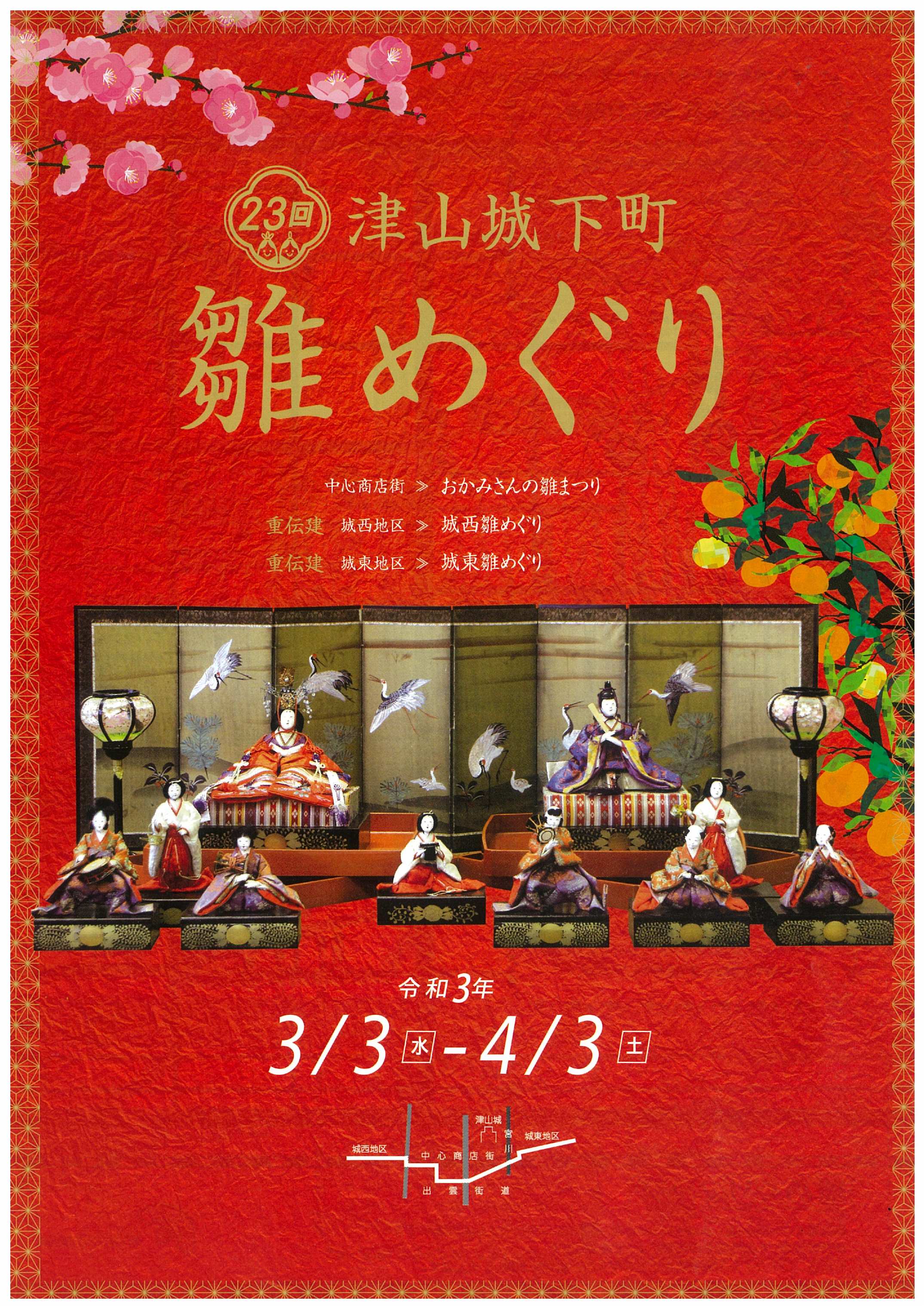 津山市内の商店など約160カ所にお雛さまを展示します。雛まつりを楽しみながら街を巡り城下町津山の歴史...