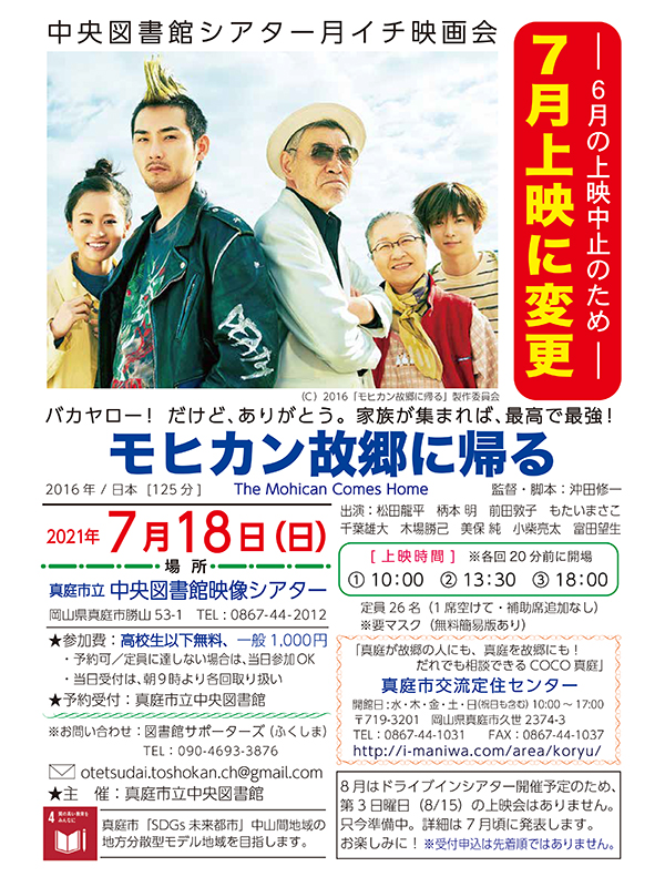 7月18日に延期になりました。6月の月イチ映画会は、「モヒカン故郷に帰る」を上映。家族が集まれば、最...