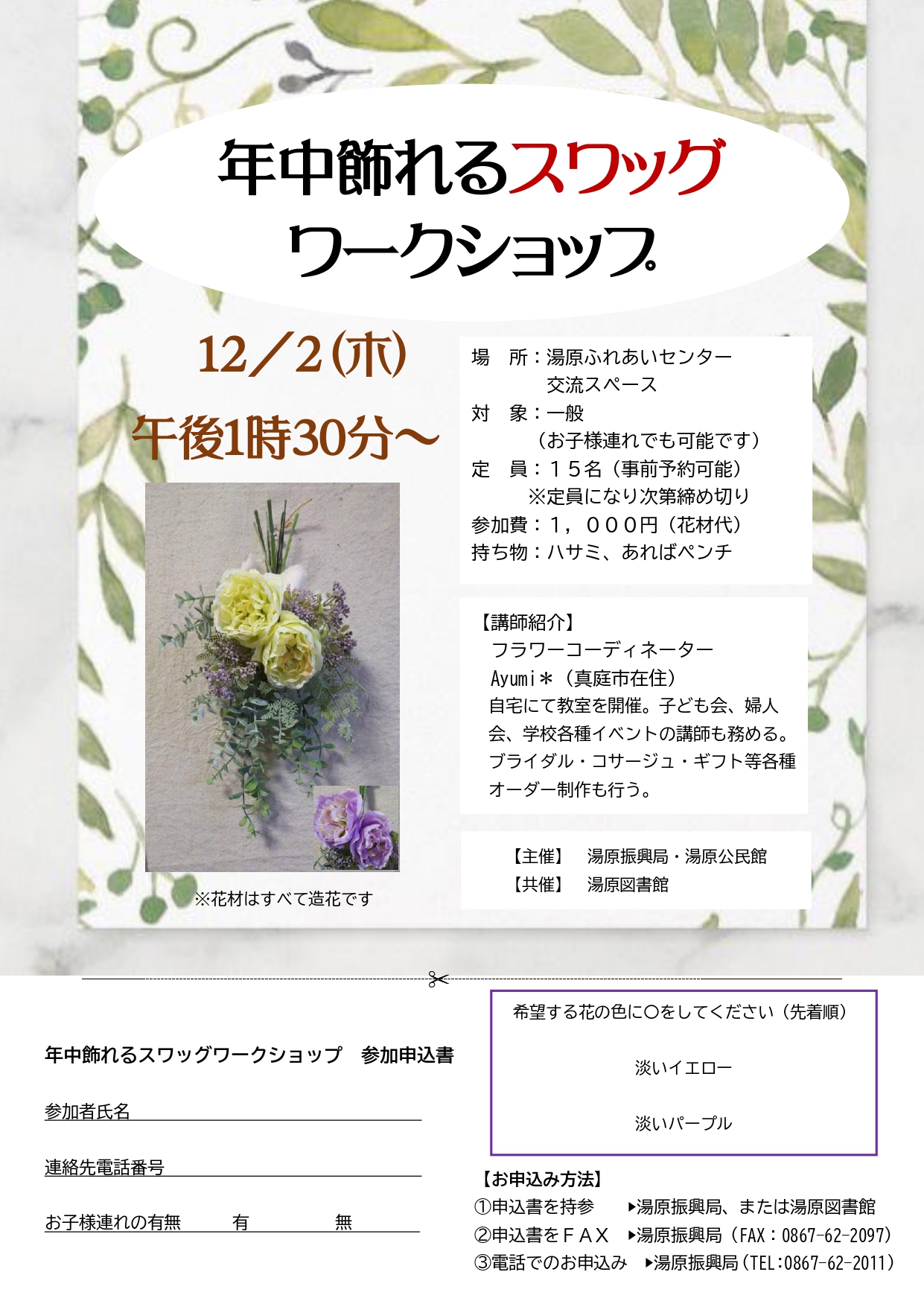 講師は真庭市在住のフラワーコーディネーターのAyumi*さんです。基本のアレンジに季節の小物をプラス...
