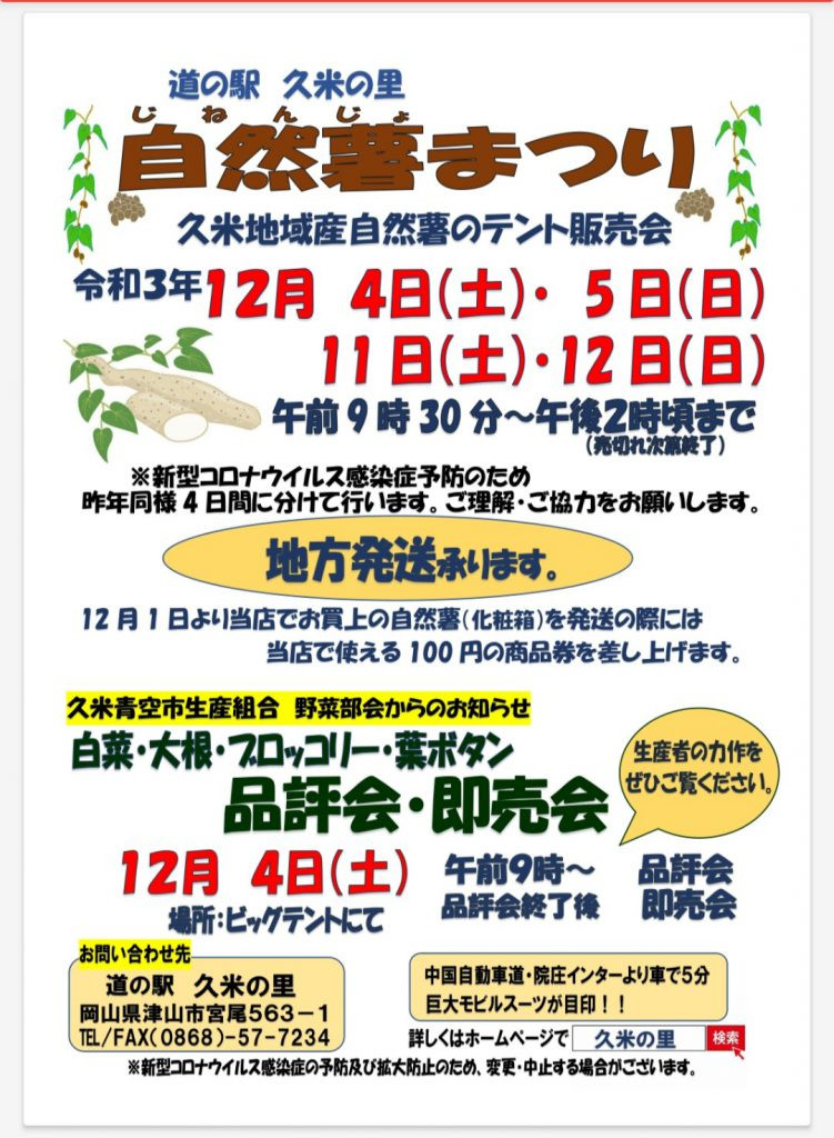 道の駅久米の里で、久米地域産の自然薯のテント販売が12月4日(土)、5日(日)、11日(土)、12日...