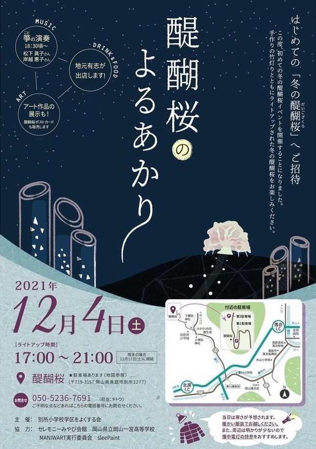 日時2021年12月4日(土)場所醍醐桜真庭市別所2277【問い合わせ】 050-5236-769...