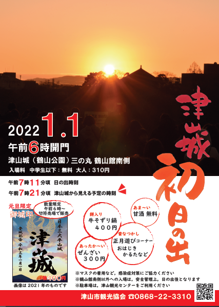 毎年恒例となりました津山城で初日の出イベントを開催します!そずり鍋やぜんざい、そして甘酒もご用意して...
