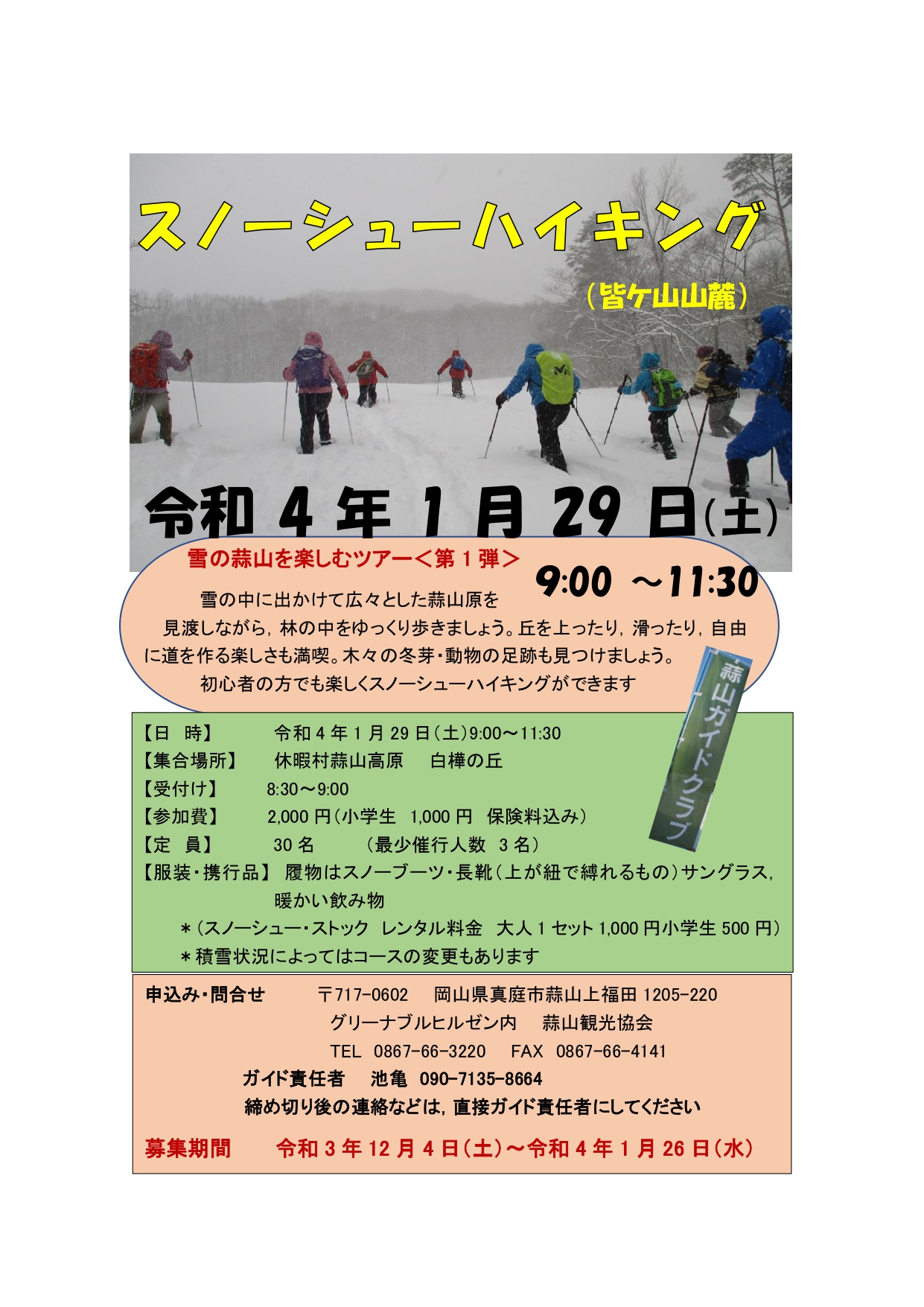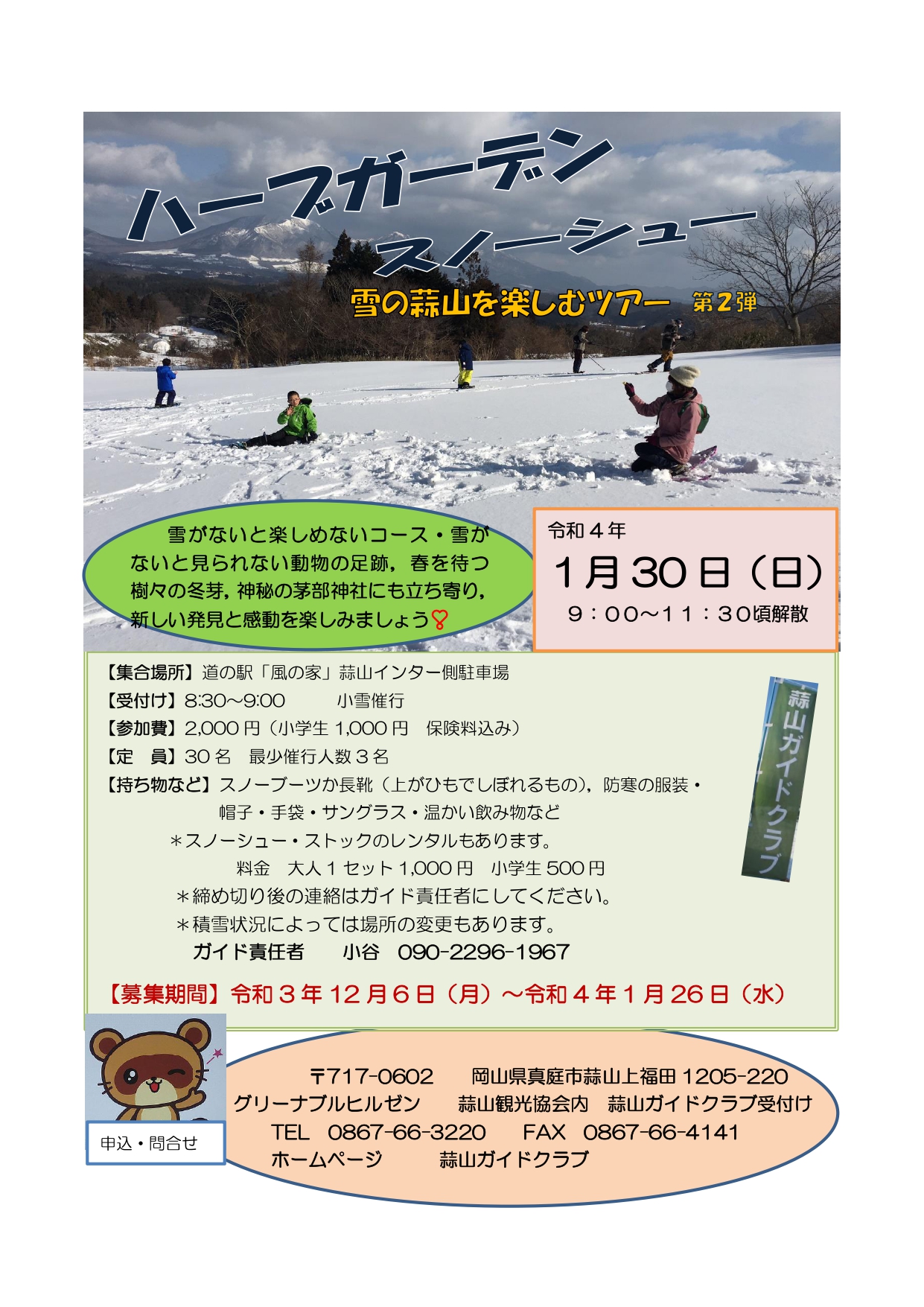 雪の中に出かけて広々とした蒜山原を見渡しながら、林の中をゆっくり歩きましょう♪丘を上ったり滑ったりと...
