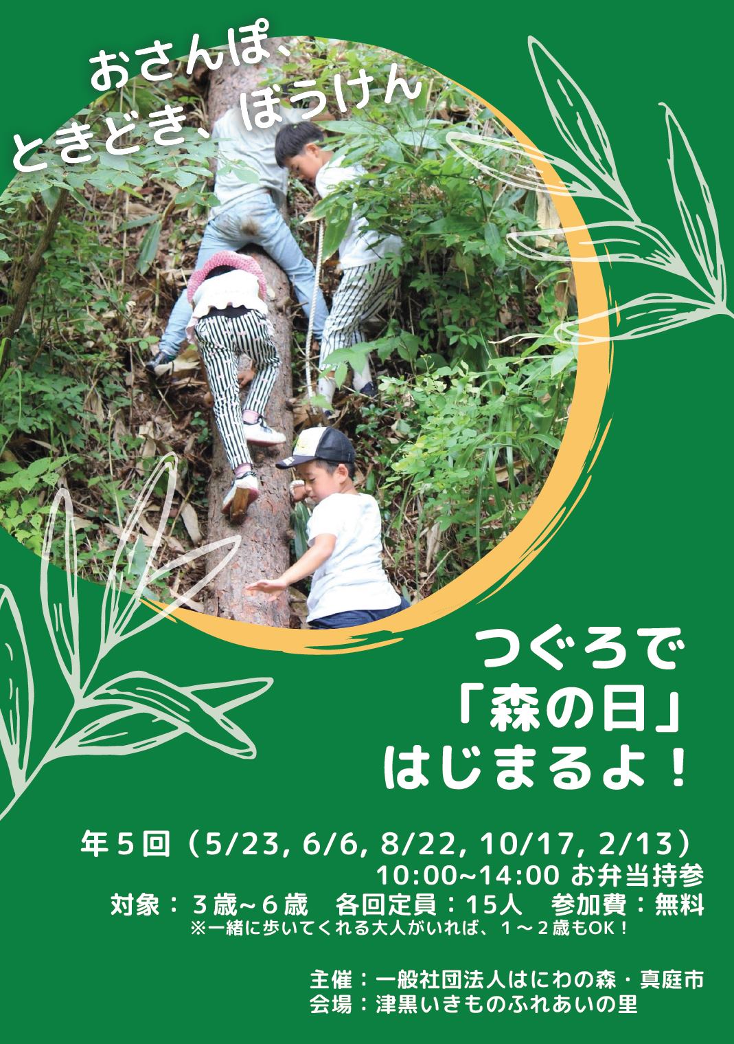 つぐろの森を歩いて、木や草や生き物たちと遊ぼう!1年に5回開催され、季節によって様々な体験ができます...
