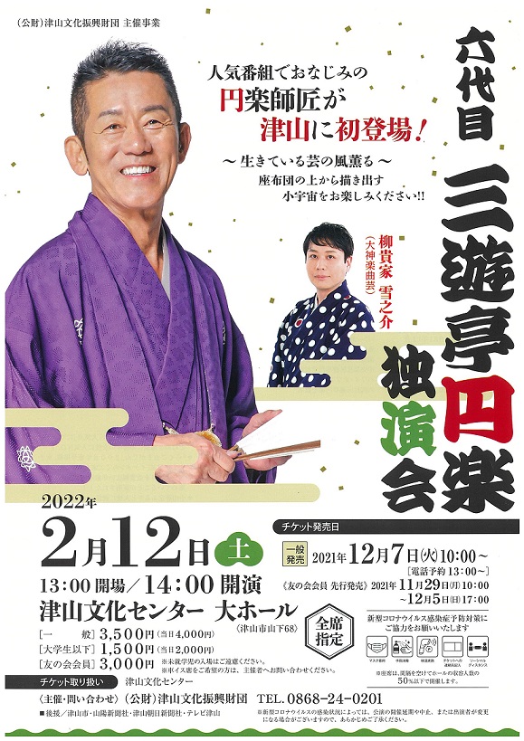 人気番組でおなじみの円楽師匠が津山に初登場!生きている芸の風薫る~座布団の上から描き出す小宇宙をお楽...