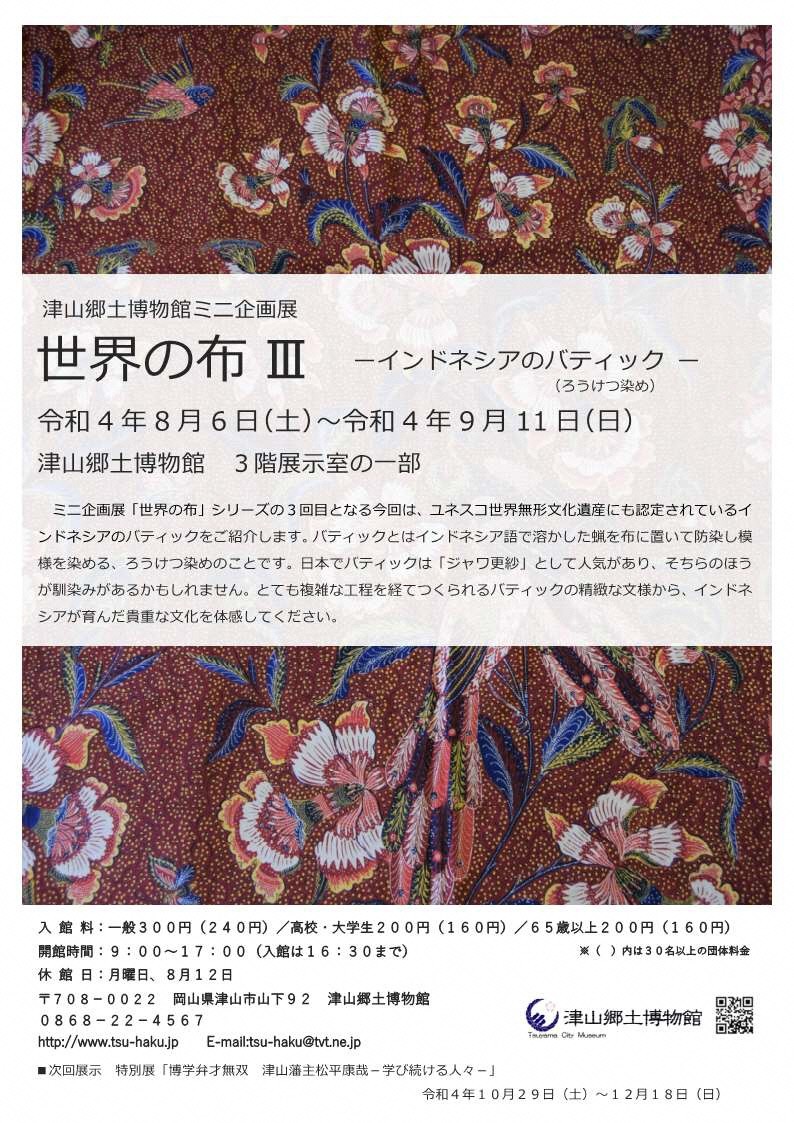 日時2022年8月6日(土)~9月11日(日)場所津山郷土博物館津山市山下92【問い合わせ】津山郷土...
