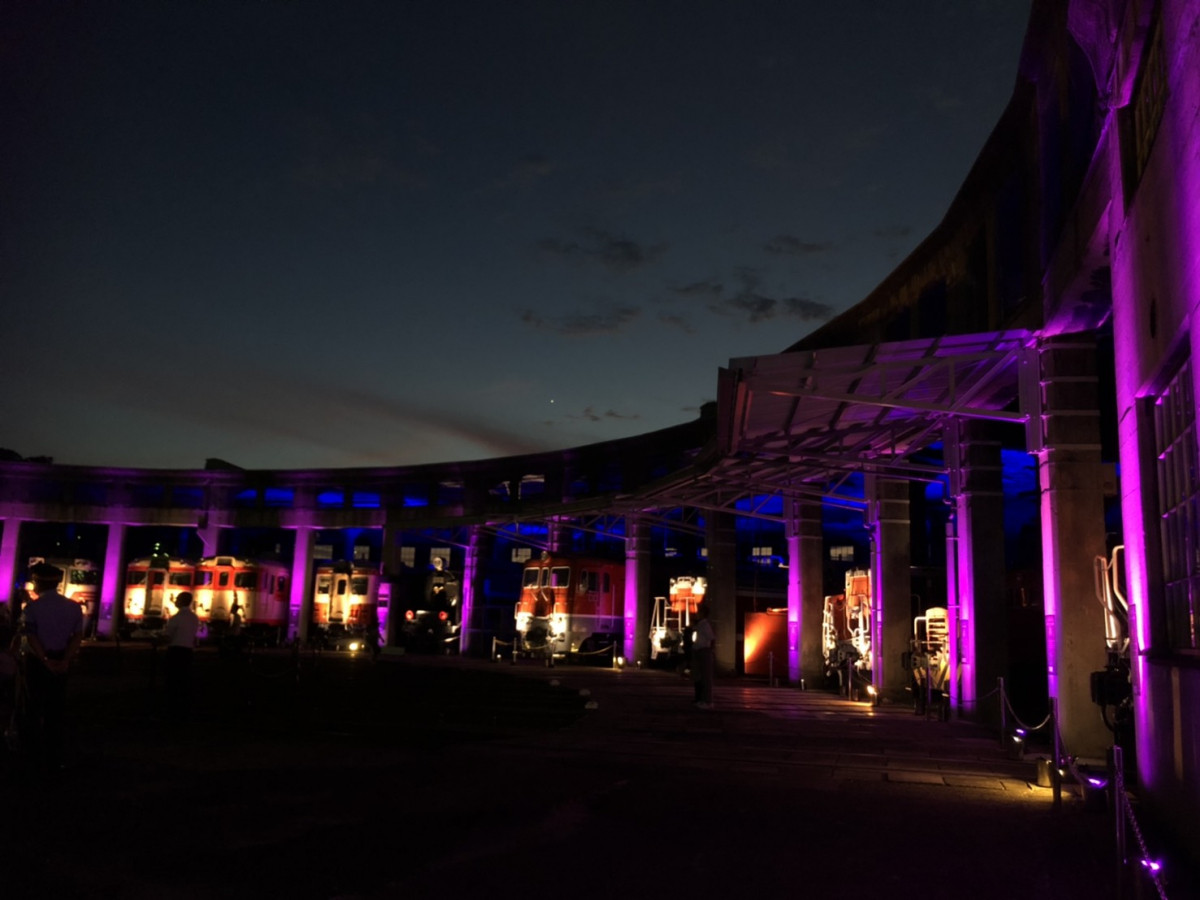 熱い日中を避けて、夕暮れ~夜の時間帯に、館内をライトアップ。ライティングした「転車台回転実演(19:...
