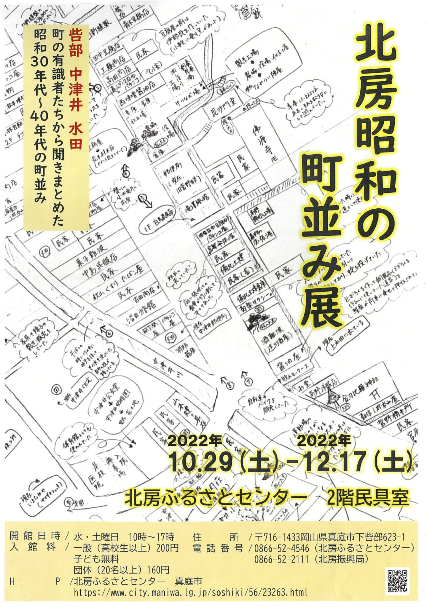 北房地域の昭和の町並みをまとめた地図を展示します。地図は、町の有識者たちから聞き取りし、作成しました...
