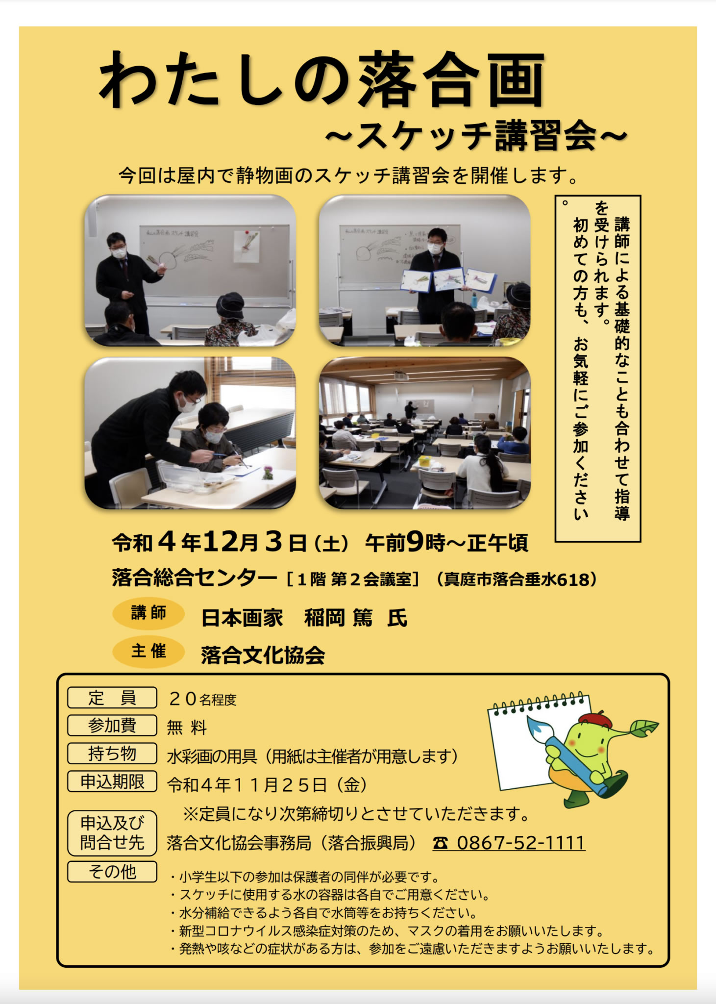 落合文化協会で年に2回開催されているスケッチ講習会です。今回は、屋内で静物画のスケッチを行います。講...