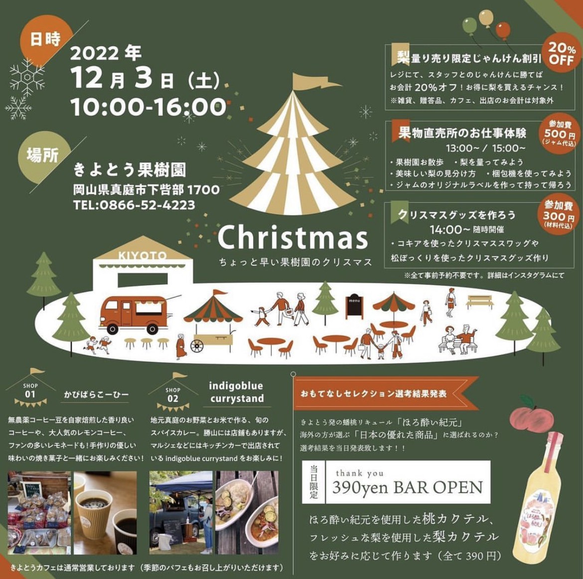 日時2022年12月3日(土)場所きよとう果樹園真庭市下呰部1700【問い合わせ】きよとう果樹園 0...