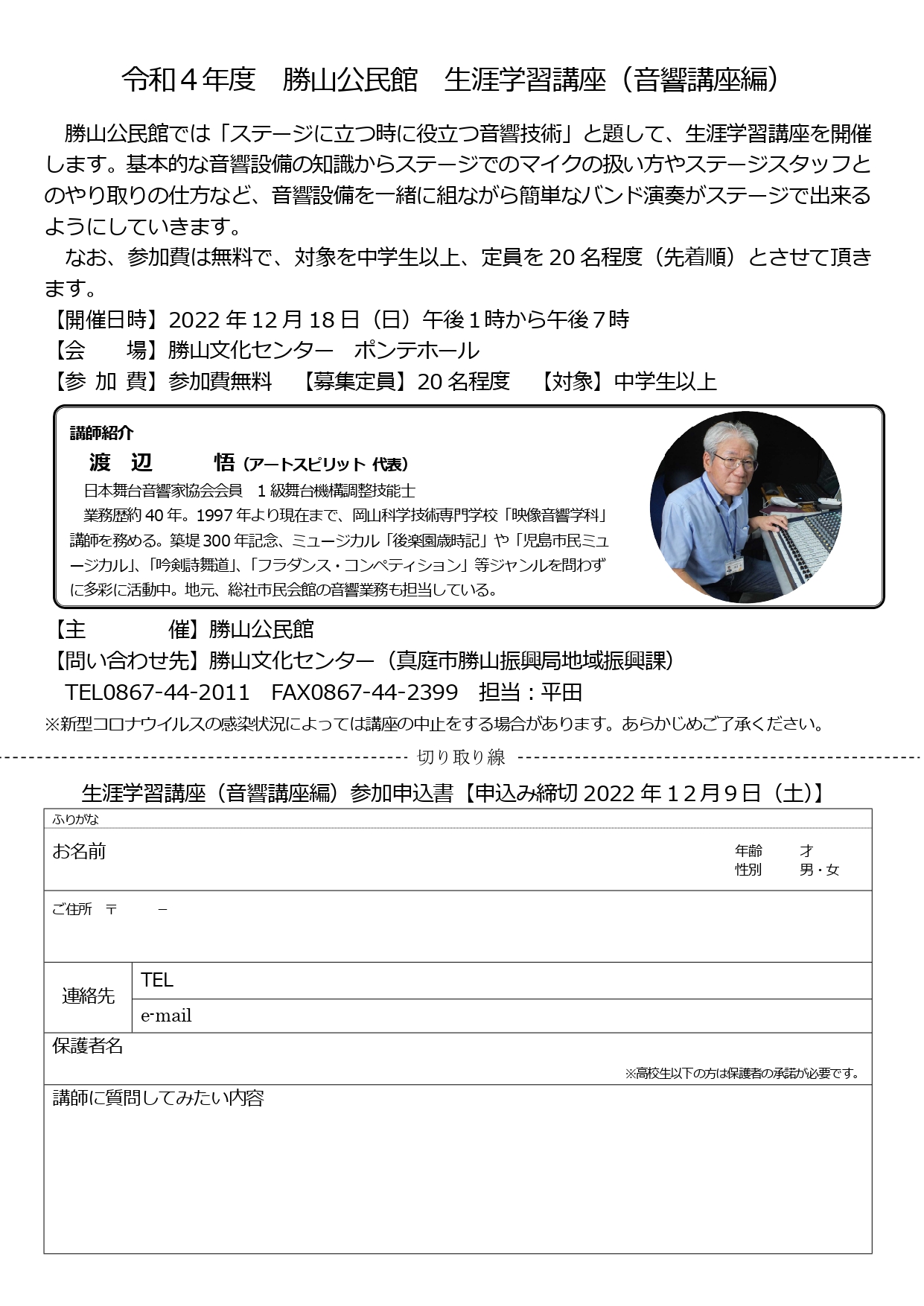 勝山公民館では「ステージに立つ時に役立つ音響技術」と題して、生涯学習講座を開催します。基本的な音響設...