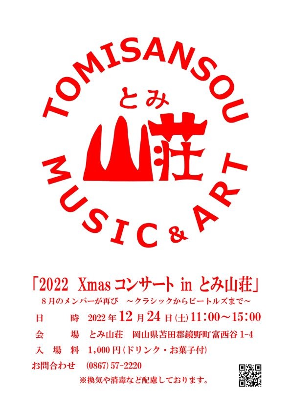 日時2022年12月24日(土)場所とみ山荘鏡野町富西谷1-4【問い合わせ】とみ山荘 0867-57...