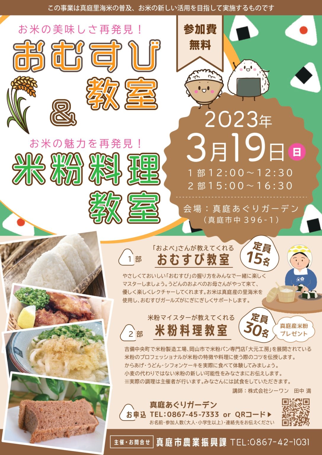 真庭里海米の普及・お米の新しい活用を目指して「おむすび教室&米粉料理教室」を開催します。県内の人気う...