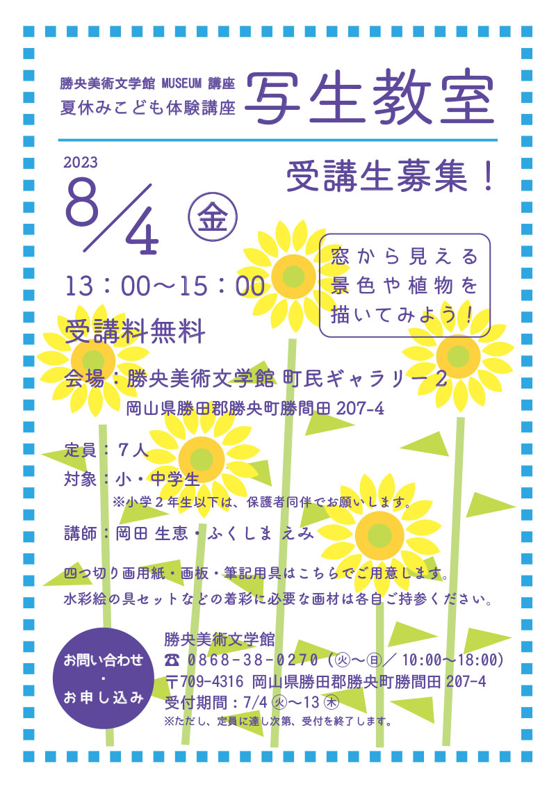 窓から見える景色や植物を描いてみよう!【日程】令和5年8月4日【時間】13:00~15:00【会場】...
