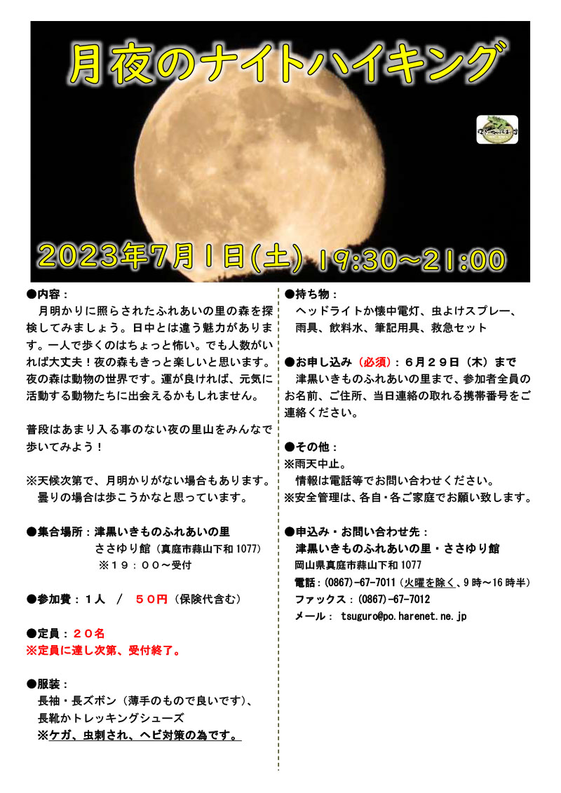 月明かりに照らされたふれあいの里の森を探 検してみましょう。【日程】2023年7月1日(土)【時間】...