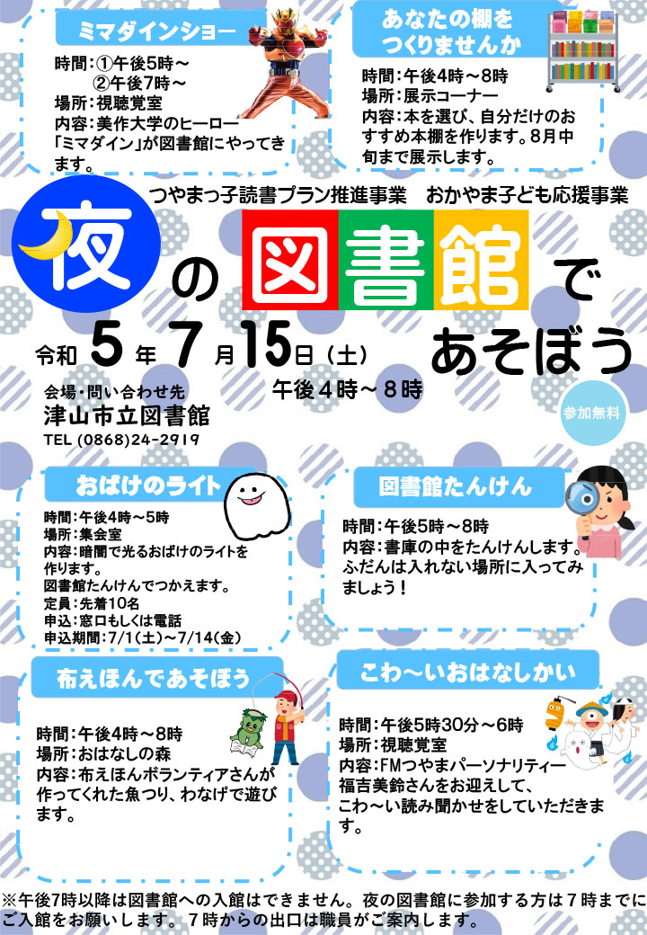 【日程】令和5年7月15日(土)【時間】午後4時~8時 ※午後7時以降は図書館への入館はできません。...