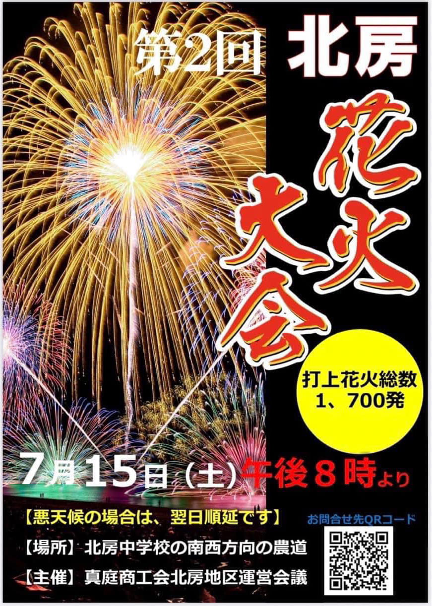 真庭市北房地区で開催される花火大会です【日程】7月15日(土)※ 悪天候の場合は翌日順延【時間】20...