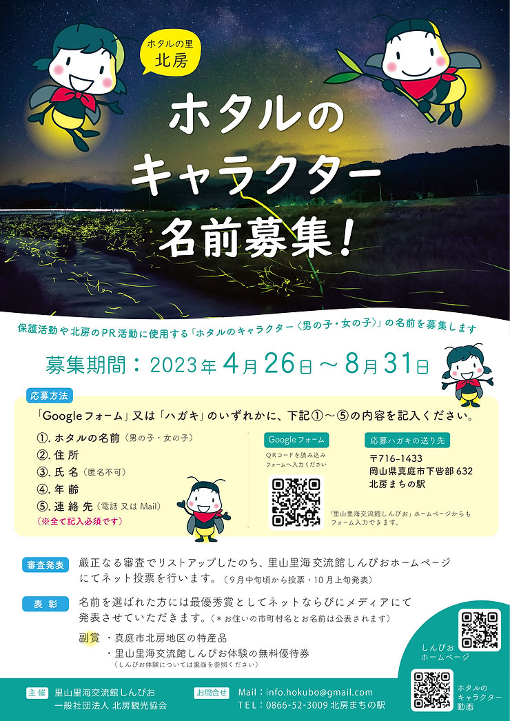この度、今後の保護活動や北房のPR活動に使用する「ホタルのキャラクター〈男の子・女の子〉」の名前を募...