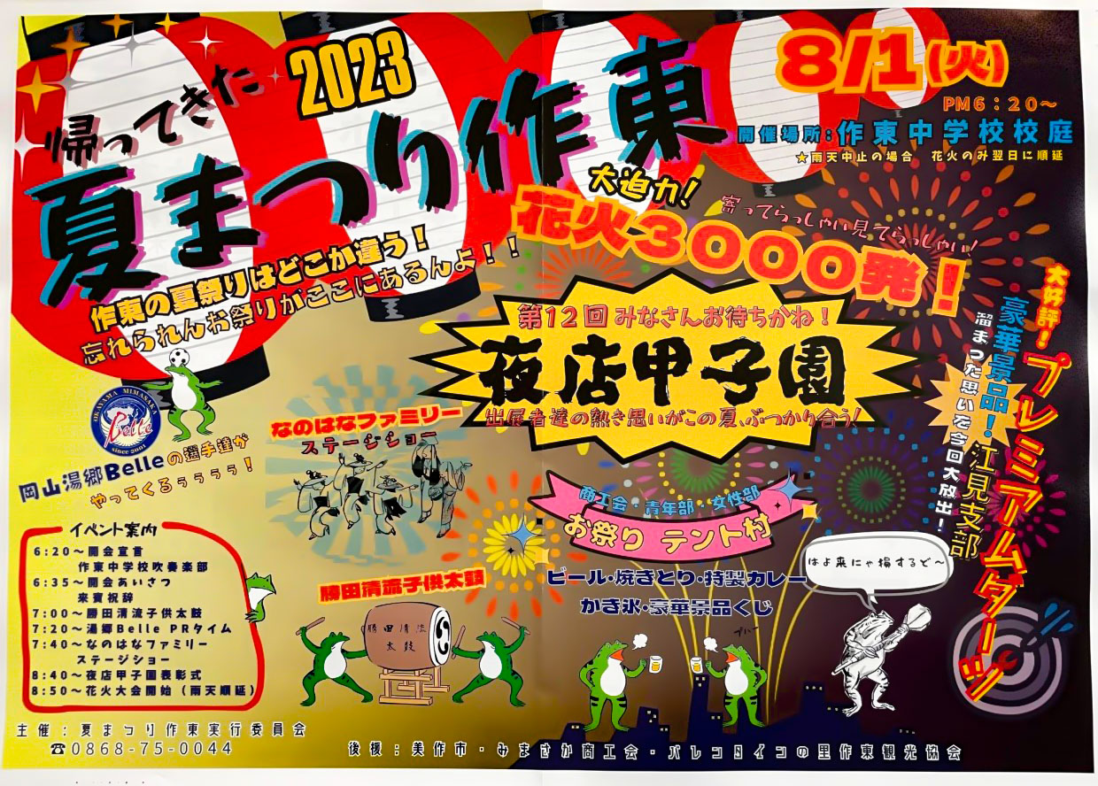 【日程】令和5年8月1日(火曜日)【時間】18:00~21:00【会場】作東中学校グラウンド(美作市...