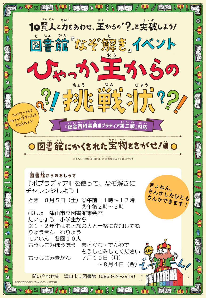 総合百科事典『ポプラディア』を使って、なぞ解きにチャレンジしよう。全て解けたらひゃっか王の宝物がもら...
