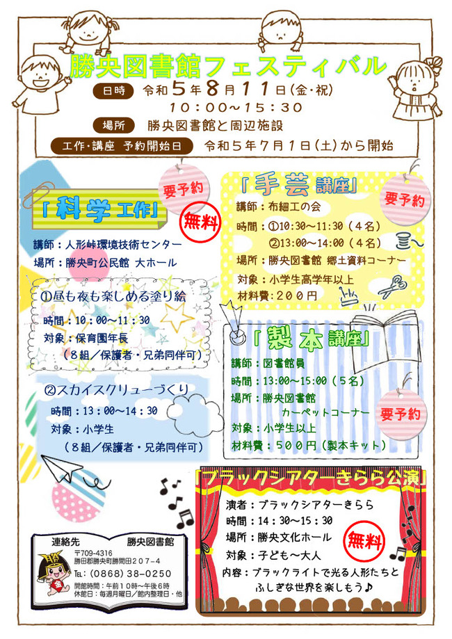 8月11日(金・祝)午前10時から図書館フェスティバルを開催します。参加予約は7月1日(土)午前10...