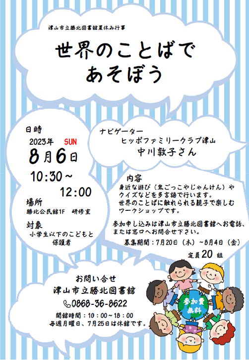 身近な遊び(鬼ごっこやじゃんけん)やクイズなどを多言語で行います。世界のことばに触れられる親子で楽し...