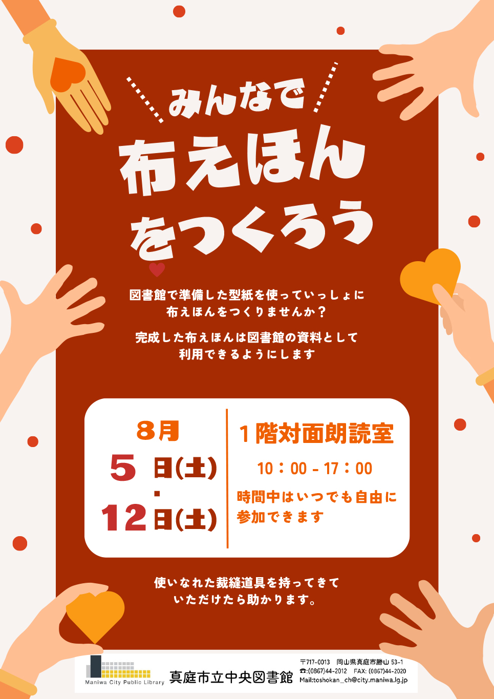 図書館で準備した型紙を使っていっしょに布えほんをつくりませんか?完成した布えほんは図書館の資料として...