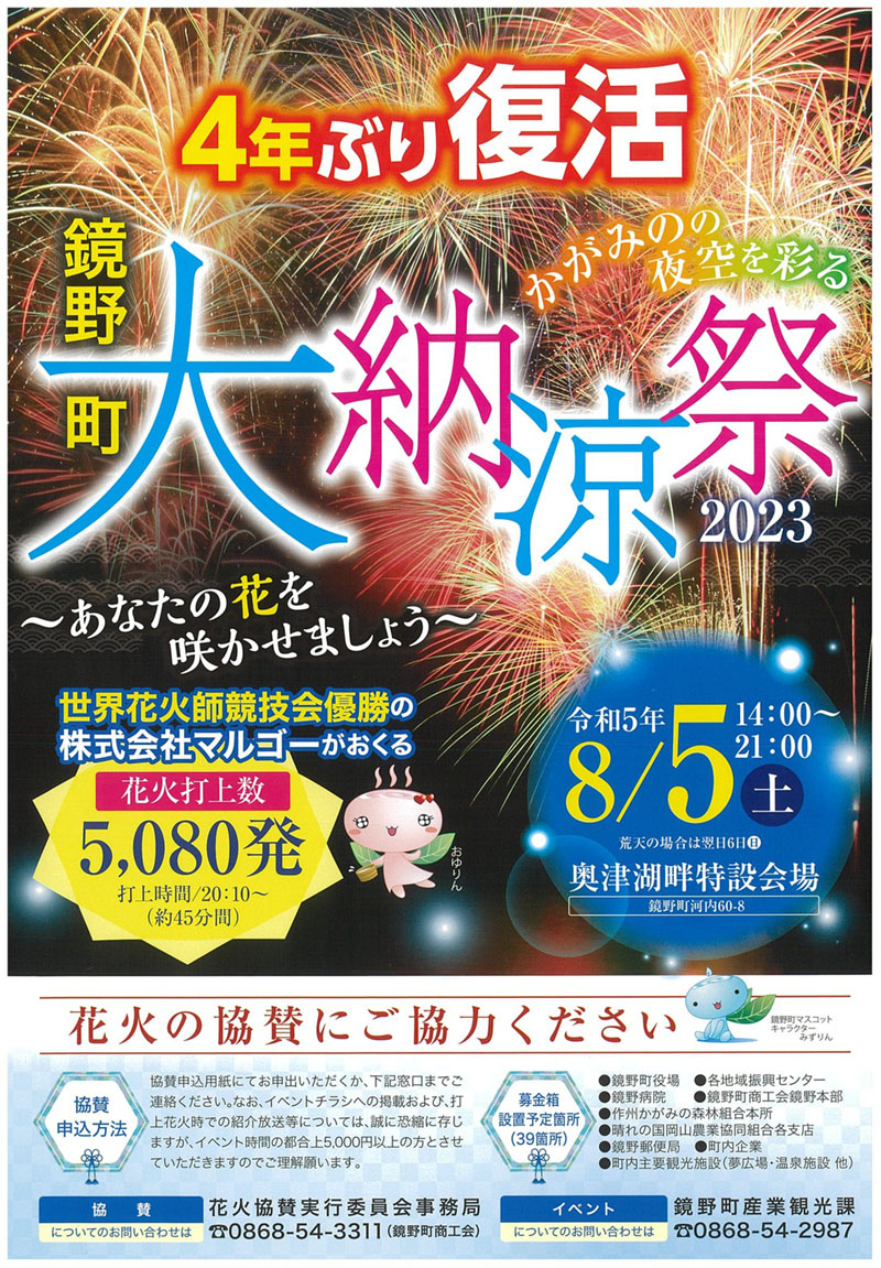 【日程】令和5年8月5日(土)※荒天の場合は翌日6日(日)【時間】14:00~21:00【場所】奥津...