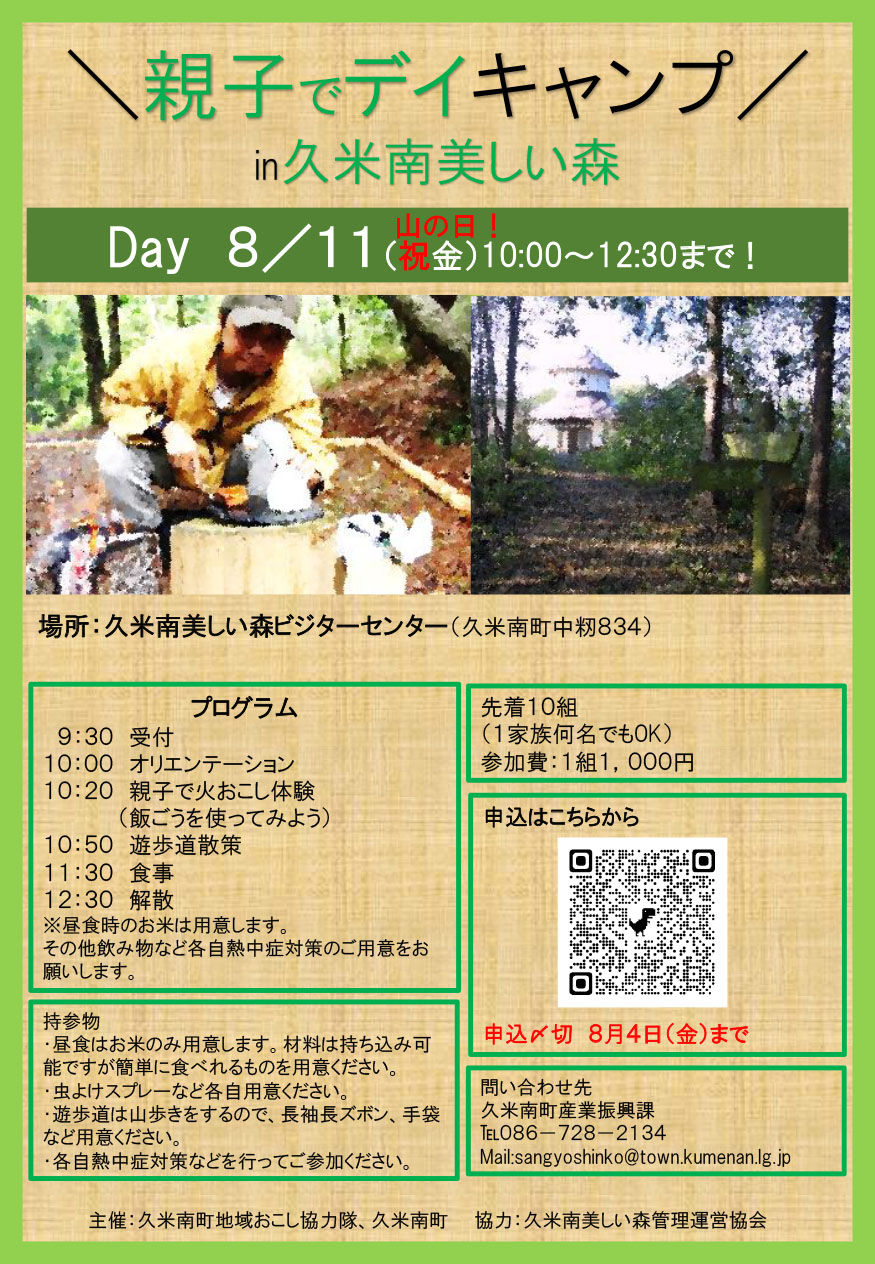 【日程】令和5年8月11日(金・祝)【時間】10:00~12:30【場所】久米南美しい森ビジターセン...