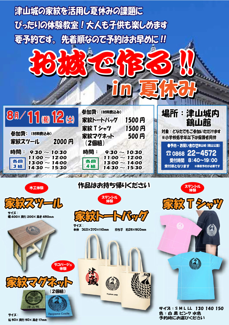 津山城の家紋を活用し夏休みの課題にぴったりの体験教室!大人も子供も楽しめます。要予約です。先着順なの...