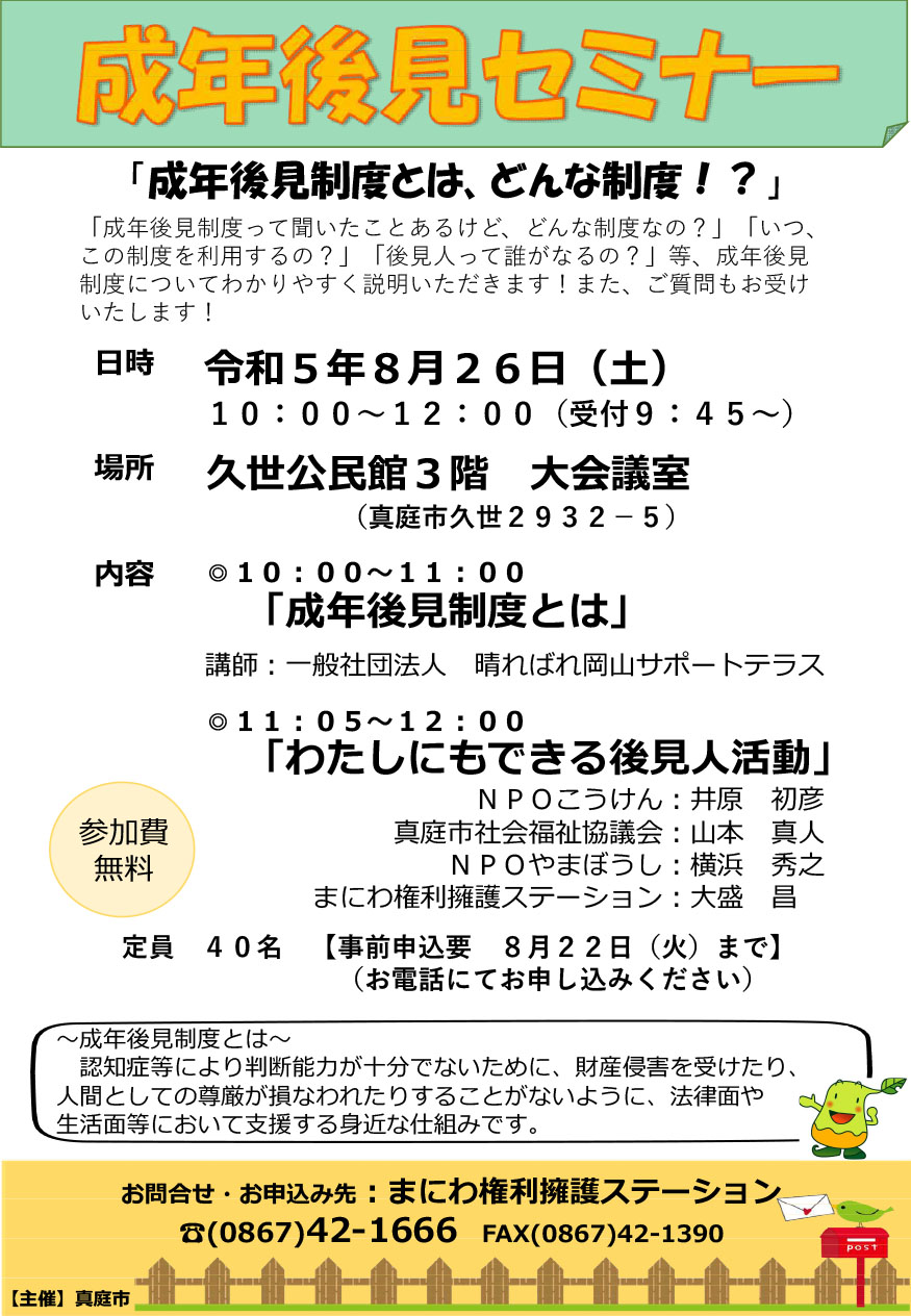 成年後見制度や後見人の活動について分かりやすく説明します。【日程】令和5年8月26日(土)【時間】午...
