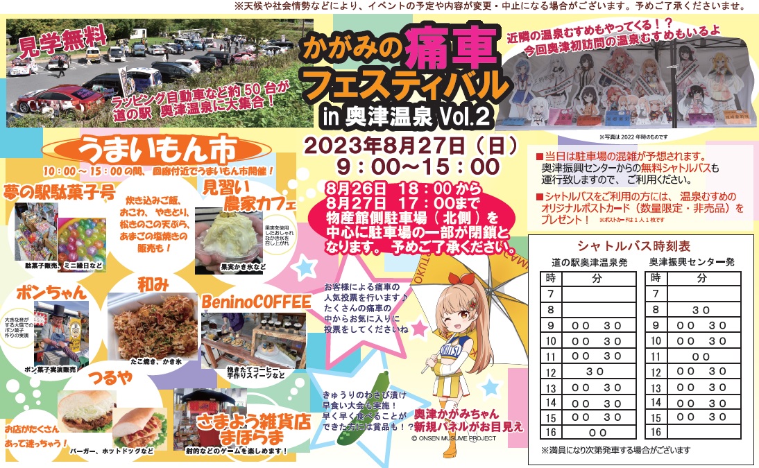 【日程】2023年8月27日【時間】9:00~15:00【会場】道の駅奥津温泉(苫田郡鏡野町奥津46...