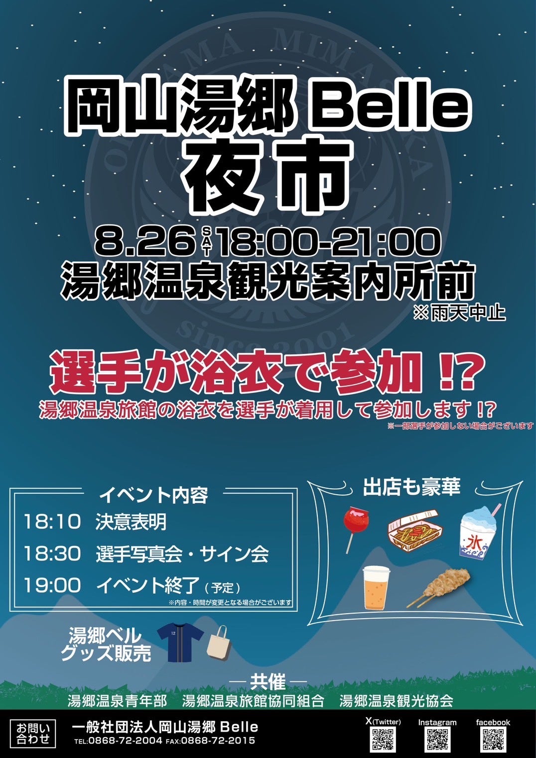 女子サッカーチーム岡山湯郷Belleの選手・関係者が中心となった夜市が開催されます。【日程】2023...