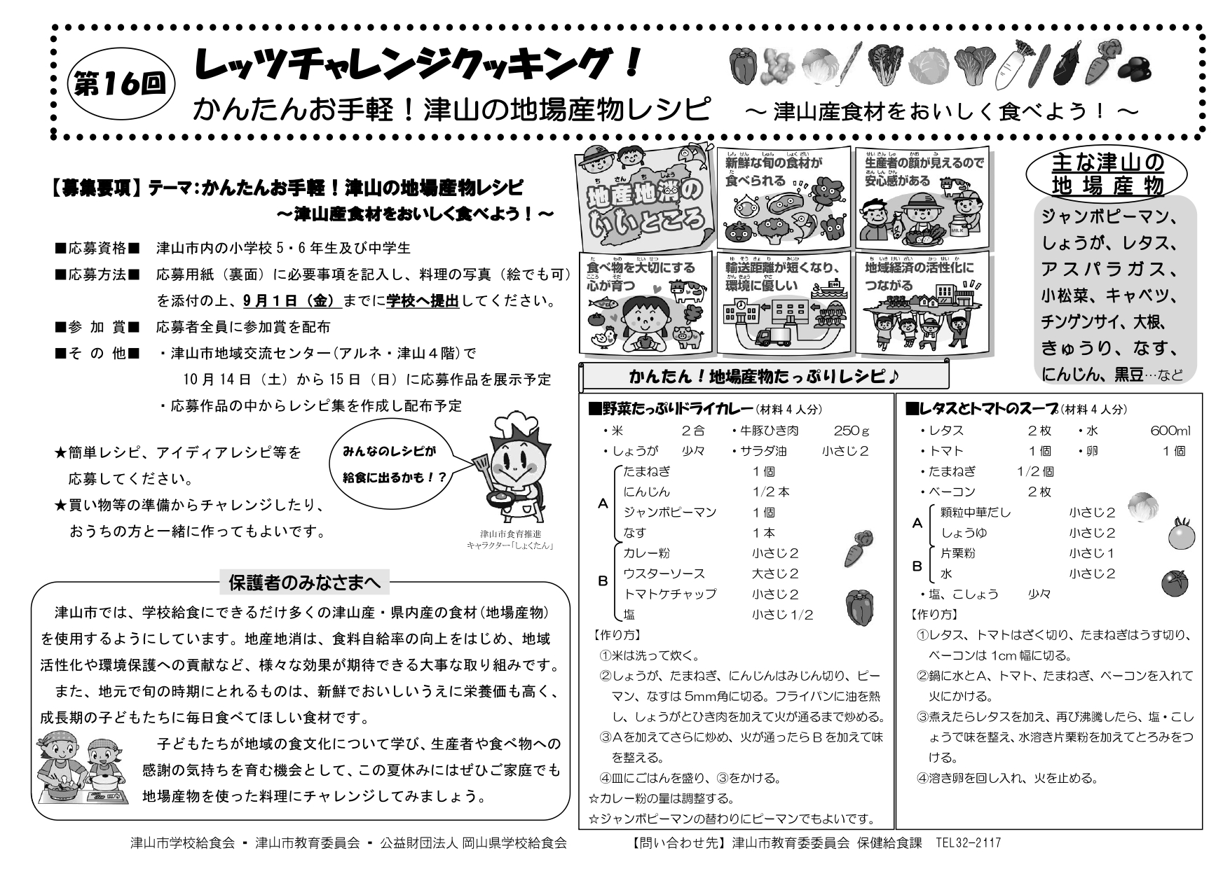 夏休みを利用してご家庭で楽しくチャレンジしてみましょう。今年のテーマは かんたんお手軽!津山の地場産...